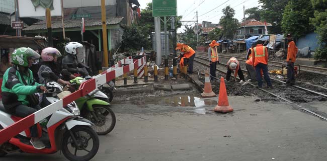 Perbaikan Jalan di Perlintasan KA: Sejumlah pekerja tampak tengah memperbaiki jalan ambrol yang berlubang di perlintasan kereta api kawasan Manggarai, Jakarta, Selasa (11/10). Kondisi cuaca dan tingginya curah hujan mengakibatkan jalan di perlintasan tersebut rusak, sehingga dapat membahayakan kereta api dan juga pengguna jalan. Putu wahyu Rama/RM
