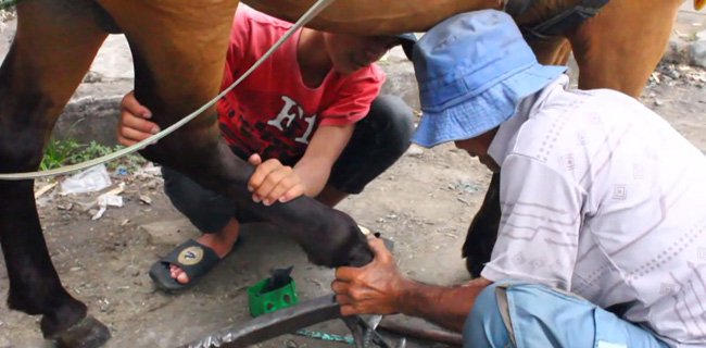 Jika telapak kuku kuda tersebut sudah tua atau rapuh, terpaksa kaki kuda harus diikat menggunakan tali. Pasalnya jika tidak diikat, kuda tersebut akan berontak, Mungkin binatang gagah ini merasa kesakitan,†kata Jamhur, Kamis siang (13/10).