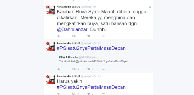 screenshot kicawan Awwaluddin Jalil tersebut, yang berbunyi: "Kasihan Buya Syafii Maarif, dihina hingga dikafirkan. Mereka yg menghina dan mengkafirkan buya, satu barisan dgn @Dahnilanzar. Duhhh..."