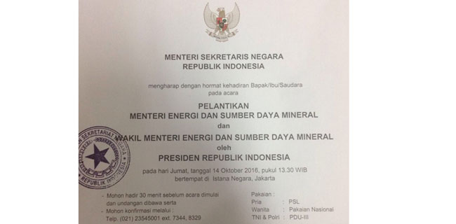 Mengacu undangan yang tersebar di grup Whatsapp wartawan, tertera pelantikan menteri dan wakil menteri ESDM dijadwalkan sehabis Jumatan nanti, pukul 13.30 WIB di Istana Negara, Jakarta.