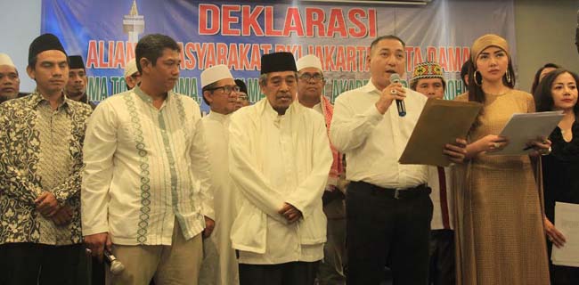Ketua Umum Jaringan Advokat Republik Indonesia (Jari), Krisna Murti, membacakan pernyataan sikap "Deklarasi Masyarakat DKI Jakarta Cinta Damai" bersama tokoh ulama, tokoh masyarakat, akademisi dan tokoh pemuda, di Jakarta (Senin, 17/10). Deklarasi tersebut tidak terlepas dari suhu politik ibu kota yang memanas diwarnai isu SARA menjurus pada perpecahan dan konflik sosial menjelang Pilkada. Dwi Pambudo/Rakyat Merdeka
