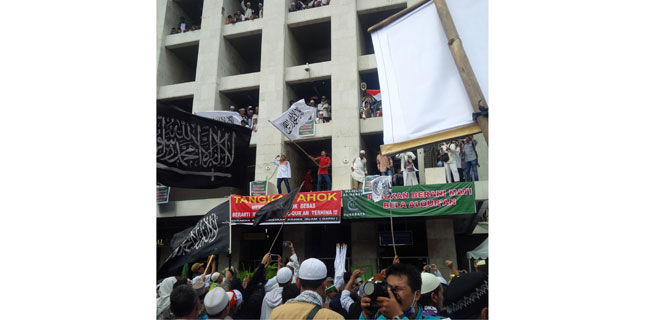 "Tangkap Ahok! Jangan dikasih makan," lantang seorang orator dari sudut atas masjid disampingnya seorang pendemo berpeci putih mengibar-ngibarkan bendera bertuliskan syahadat dalam bahasa Arab.