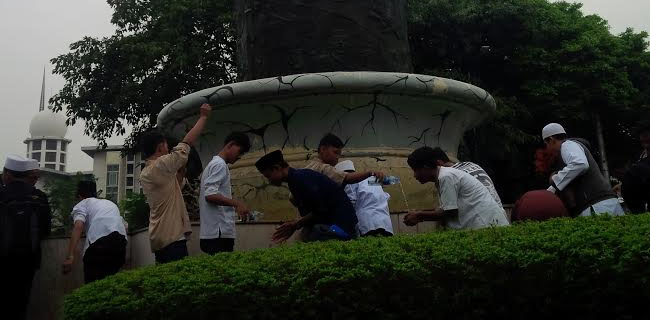 pula puluhan orang aksi juga terlihat mengambil wudu di kolam Tugu