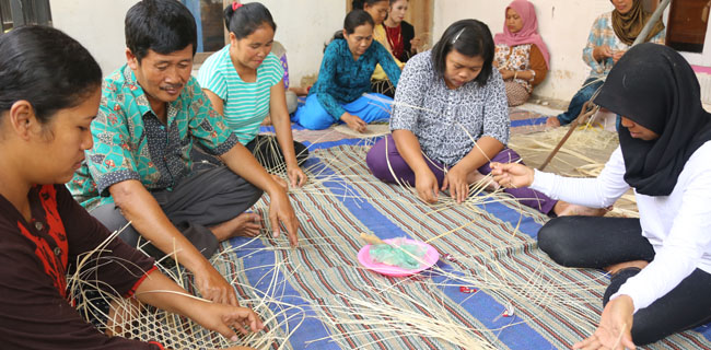 Puluhan ibu-ibu rumah tangga di Banyuwangi tampak antusias mengikuti pelatihan yang bertempat di rumah salah satu warga di Dusun Pekarangan Desa Kelir Kecamatan Kalipuro, Banyuwangi (Selasa, 8/11). Memenuhi permintaan pasar akan kerajinan bambu, para pengrajin di Banyuwangi mulai melibatkan ibu-ibu rumah tangga. Para perempuan ini dilatih cara membuat bahan baku anyaman bambu untuk kemudian dipasok ke pengrajin bambu. Repro