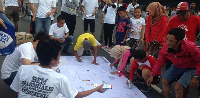 Warga yang tengah menikmati hari bebas kendaraan bermotor di kawasan itu pun antusias mengikuti kampanye pesan perdamaian Indonesia tersebut. Bahkan, mereka berebut spidol untuk membubuhkan tanda tangan di sebuah kain putih berukuran 6x1 meter yang dibentangkan di jalanan.