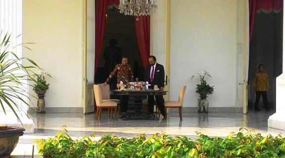 Sesudah menyantap sarapan, Jokowi dan Paloh menyampaikan keterangan pers. Mereka sepakat stabilitas bangsa merupakan hal yang tidak bisa ditawar.