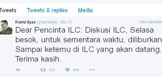 Informasi acara ILC diliburkan disampaikan sendiri oleh Karni Ilyas lewat akun Twitter-nya @karniilyas.