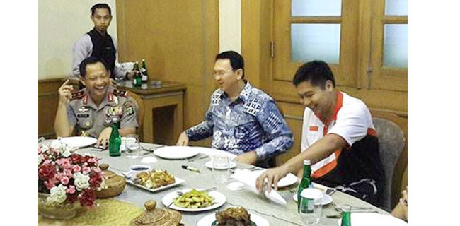 Di foto itu Tito masih bintang dua, alias menjabat Kapolda Metro Jaya. Selain Tito, ada Gubernur Jakarta Basuki Tjahaja Purnama (Ahok) dan politisi PDIP Maruarar Sirait. Ketiganya duduk di meja makan yang di atasnya terdapat makanan dan botol minuman berwarna hijau.