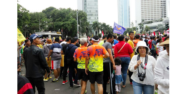 Warga yang hendak berolah raga di area Car Free Day, sepanjang Jalan Sudirman-MH Thamrin, Jakarta Pusat, Minggu pagi (4/12), terpaksa mengalah karena serbuan massa aksi Kita Indonesia beratribut baju parpol.