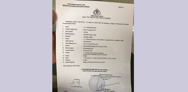 Sebagaimana surat yang diterima redaksi, laporan kepada Polda Metro Jaya ini terkait dengan pencemaran nama baik atau fitnah. Surat dibuat pada Minggu kemarin (4/12).