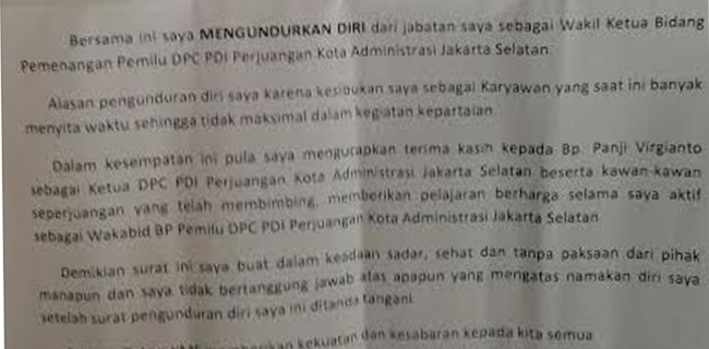 "Bersama ini saya mengundurkan diri dari jabatan saya sebagai Wakil Ketua Bidang Pemenangan Pemilu DPC PDIP Kota Administrasi Jakarta Selatan," ujarnya dalam surat yang dikirimnya ke DPP PDIP, DPD PDIP Jakarta, hingga DPC PDIP Jakarta Selatan itu.
