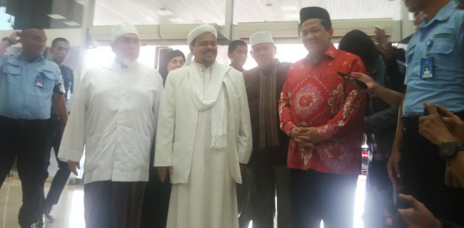 Habib Rizieq yang mengenakan jubah serba putih masuk dari pintu utama Gedung Nusantara III DPR bersama Ketua Gerakan Nasional Pengawal Fatwa Majelis Ulama Indonesia (GNPF-MUI) Bachtiar Nasir dan beberapa petinggi GNPF-MUI dan FPI lainnya.