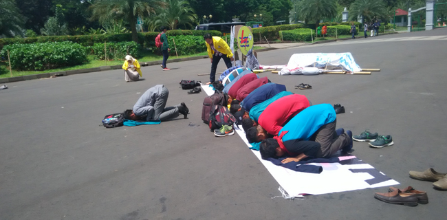 Dan sebelum gelaran aksi, sebagaian mahasiswa menjalankan ibadah shalat Dzuhur di jalur pintu Monas di Jalan Medan Merdeka Utara, Jakarta Pusat.