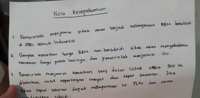 Adapun nota kesepahaman yang diteken oleh koordinator pusat BEM Seluruh Indonesia Bagus Tito Wibisono dan Teten Masduki itu adalah sebagai berikut