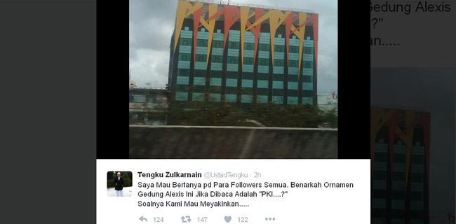 "Saya mau bertanya pada para followers semua. Benarkah ornamen gedung Alexis ini jika dibaca adalah PKI? Soalnya kami mau meyakinkan," ujarnya dalam akun jejearing sosial
