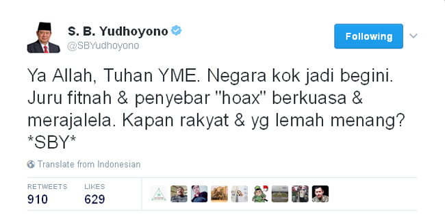"Jadi SBY yang menabur dengan bibit membangun bangsa dan negara yang kurang berkualitas, akhir Joko Widodo menuai badai hoax dan fitnah. Dan rakyat lemah banyak hilang perhatiannya," pungkasnya