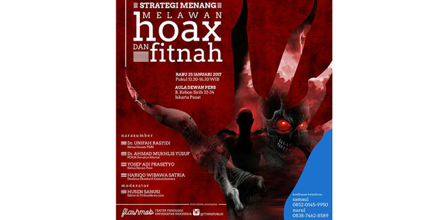 Komunikonten akan mengadakan diskusi nasional dengan mengangkat tema "Strategi Menang Melawan Fitnah dan Hoax" di Aula Dewan Pers, Jalan Kebon Sirih No. 32-34 Jakarta Pusat, Rabu besok (25/1).