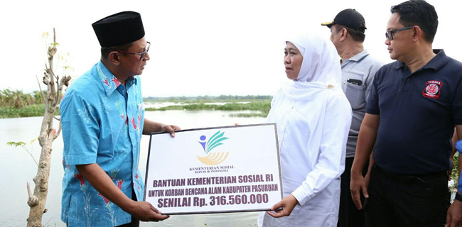 Bantuan secara simbolis diserahkan Mensos kepada perwakilan warga saat meninjau korban banjir di Kelurahan Kedung Ringin, Kecamatan Beji, Kabupaten Pasuruan, Minggu petang (5/2). Bantuan tersebut diberikan dalam bentuk paket lauk pauk, matras, selimut, kidsware, family kit, foodware dan tenda gulung.