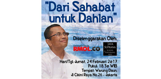 Agenda tersebut bertajuk "Dari Sahabat Untuk Dahlan", yang akan dilaksanakan besok malam (Jumat, 24/2), pukul 18.30 WIB di Warung Daun, Cikini, Jakarta. Acara ini digagas oleh Kantor Berita Politik RMOL dan Jaya Suprana School of Performing Arts.