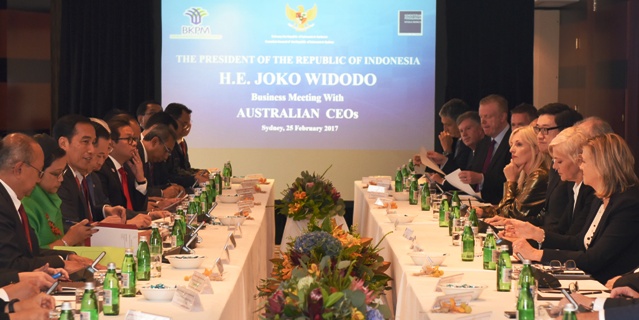setkab.go.id, Presiden Jokowi didampingi oleh Menteri Luar Negeri Retno LP Marsudi, Menteri Perdagangan Enggartiasto Lukita, Sekretaris Kabinet Pramono Anung, Kepala BKPM Thomas Lembong, Kepala Bekraf Triawan Munaf, dan Konjen dan Konsulat RI untuk Australia serta dihadiri sejumlah CEO dari perusahaan-perusahaan di Australia.