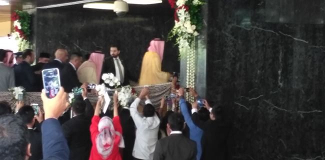 Begitu turun dari mobil limo warna hitam, sambil melambaikan tangan ke masyarakat dan media yang meliput, Sang Raja disambut oleh Ketua DPR RI Setya Novanto beserta para wakilnya dan Ketua MPR RI Zulkifli Hasan. Mereka nampak berbincang ringan.