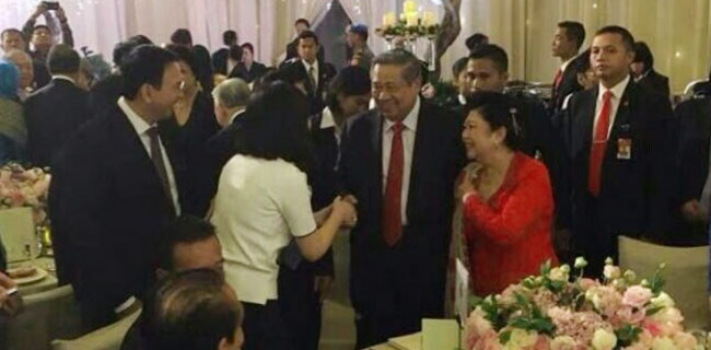 Nah, dalam foto yang beredar tersebut, Presiden RI keenam dan sang istri berinteraksi dengan Ahok dan Veronica Tan. Belakangan diketahui, mereka bertemu di acara pernikahan putra pengusaha Prajogo Pangestu di Hotel Mulia, Jakarta, Minggu malam kemarin. Veronica yang memakai baju berwarna putih terlihat salaman dengan SBY. Sementara Ibu Ani berkebaya merah berdiri di samping SBY. Meski tak berpelukan, mereka berempat tersenyum lebar. Presiden Jokowi juga hadir dalam acara itu, namun tidak diketahui apakah SBY dan Jokowi sempat bertemu atau datang pada waktu yang sama.