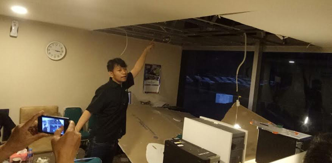 Sekitar pukul 15.10 WIB tadi, eternit ruang Pengurus Koordinatoriat Wartawan Parlemen mendadak rubuh. Eternit yang cukup berat itu hampir menimpa salah satu pengurus, Freddy Batari.