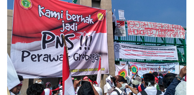 Mereka berunjuk rasa menuntut diangkat menjadi Pegawai Negeri Sipil (PNS).