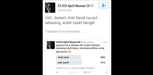 Hasilnya, cukup mengagetkan Iwan Fals. Pasalnya, meski suara sempat berimbang antara kedua paslon, namun berselang satu jam kemudian, ‘skor’ berubah. Anies-Sandi menjadi unggul dengan prosentase 51 persen, sedangkan Ahok-Djarot hanya 49 persen.