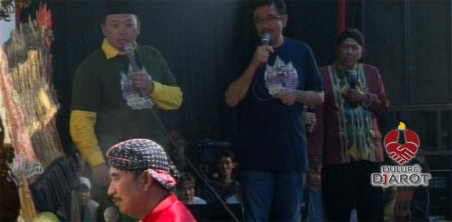 Koordinator Bidang Pemenangan Pemilu Partai Golkar Wilayah Indonesia I (Jawa dan Sumatera), Nusron Wahid bersama calon Wakil Gubernur DKI Jakarta Djarot Saiful Hidayat menikmati pertunjukan pagelaran wayang kulit dengan dalang Ki Entus Susmono, di Lapangan Pesanggrahan, Jakarta Selatan, Sabtu malam (1/4). BERIKUTNYA >