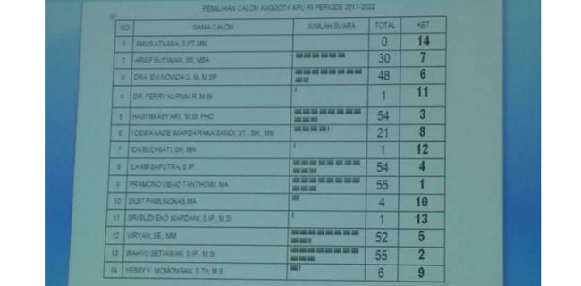 Berikut perolehan lengkap pemilihan calon komisioner KPU: