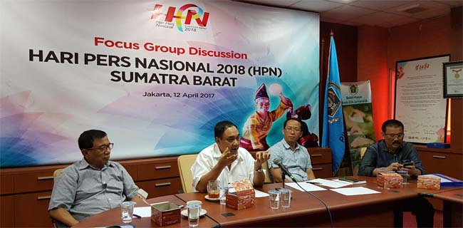 Penanggung Jawab Hari Pers Nasional (HPN) 2018 Margiono berbicara dalam Focus Group Discussion (FGD) HPN di Gedung Dewan Pers, Jalan Kebon Sirih, Jakarta, Rabu (12/4). HPN 2018 akan diselenggarakan di Sumatera Barat, bulan Februari 2018.