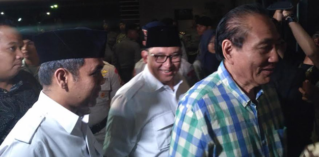 Mereka tiba dengan menggunakan sebuah mobil sedan hitam. Keduanya memakai kemeja putih dan peci hitam, sebuah tampilan khas pasangan Anies Baswedan-Sandiaga Uno.