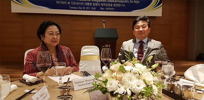 Keistimewaan Mega, sebutan akrabnya, semakin lengkap saat Gubernur Jeju Won Hee-ryong bersama Ketua DPRD kepulauan berstatus otonomi khusus ini menjamu Ketua Umum PDI Perjuangan makan malam bersama.