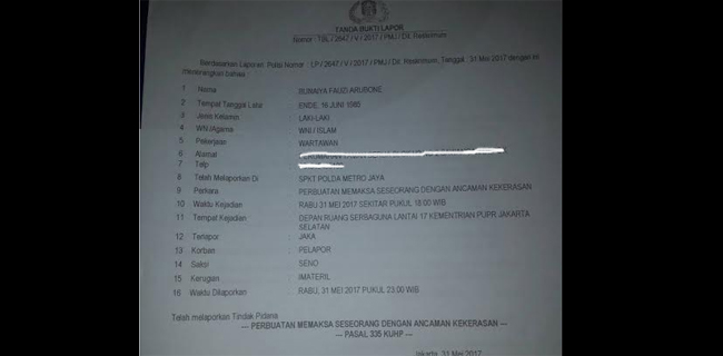 RMOL melaporkan protokoler Kementerian PUPR bernama Jaka atas perbuatan memaksa seseorang dengan ancaman kekerasan (pasal 335 KUHP).