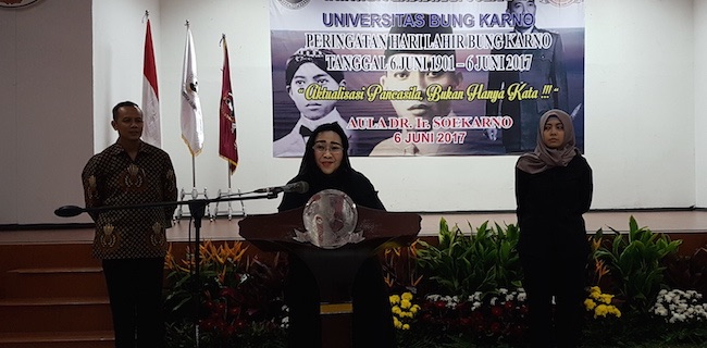 “Nilai Pancasila dipraktikkan di tengah kehidupan berbangsa dan bernegara melalui kebijakan-kebijakan yang memang mencerminkan semangat Pancasila sebagai grondslag (dasar) negara. Bukan dengan membuat kebijakan yang bertentangan dengan Pancasila, kebijakan yang diskriminatif, kebijakan yang memperkaya segelintir orang tetapi menyengsarakan rakyat kebanyakan, seperti yang ada sekarang ini,†ujar pendiri Yayasan Pendidikan Soekarno (YPS) dan Universitas Bung Karno (UBK), Rachmawati Soekarnoputri.