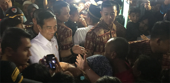 Presiden Jokowi datang tak lama setelah adzan Maghrib dan langsung menyapa warga sekitar. Dalam kesempatan ini Jokowi membagi-bagikan sembako secara langsung kepada warga.