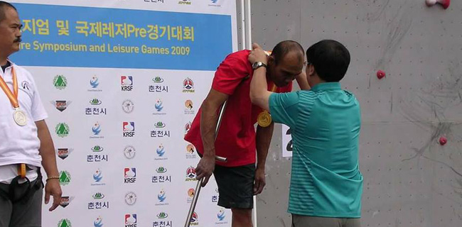Kita yang normal saja belum tentu mampu seperti dia yang hanya punya satu kaki atawa punya keterbatasan fisik alias tunadaksa. Selain itu, dia juga pernah meraih medali emas pada kejuaraan panjat dinding di Korea dan peringkat 4 panjat dinding dunia di Prancis.