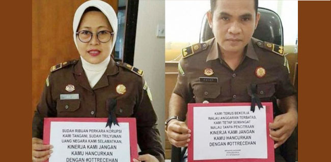 Ada dua foto yang tersebar di media sosial. Foto pertama, seorang jaksa laki-laki berseragam memegang kertas dengan tulisan, "Kami terus bekerja walau anggaran terbatas. Kami tetap semangat walau tanpa pencitraan. Kinerja kami jangan kamu hancurkan dengan #OTTRecehan". Sementara foto kedua, seorang jaksa perempuan memegang kertas seukuran, namun beda tulisan. Isinya, "Sudah ribuan perkara korupsi kami tangani, sudah triliunan uang negara kami selamatkan. Kinerja kami jangan kamu hancurkan dengan #OTTRecehan".