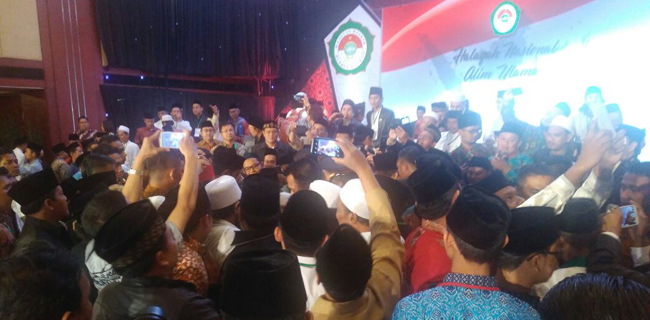 Meski sudah diatur sedemikian rupa termasuk membatasi jarak dengan presiden, namun protap tersebut sepertinya tidak berlaku bagi para kiai. Lantaran di akhir acara atau tepatnya saat sesi foto, para kiai menyerbu Presiden Jokowi untuk berfoto bersama.