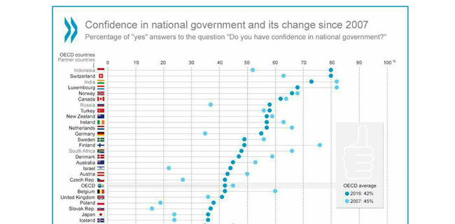 Pertengahan 2017, sebuah prestasi dan penilaian membanggakan diraih Pemerintahan Republik Indonesia. Berdasarkan data Organisation for Economic Co-operation and Development (OECD) yang menukil survei GWP dalam tajuk Government at a Glance 2017 yang dipublikasikan pada 13 Juli 2017, Indonesia menduduki peringkat pertama untuk Trust and Confidence in National Government.