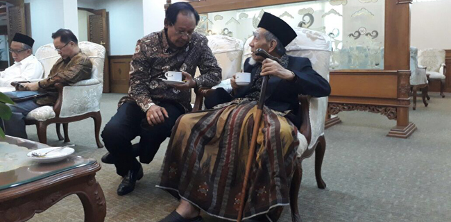 Dalam pertemuan tersebut, Mbah Moen didampingi Bu Nyai Maimoen dan anak mereka Gus Yasin Maimoen.