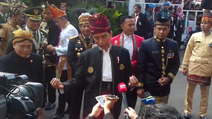Jokowi sendiri memakai pakaian adat Tanah Bumbu Kalimantan Selatan. Sementara Ibu Negara, Iriana tampak anggun dengan pakaian adat Minang berwarna merah, lengkap dengan tutup kepalanya.