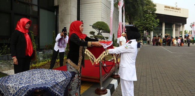 Menteri Sosial Khofifah Indar Parawansa memimpin upacara diikuti peserta yang seluruhnya berbusana adat berbagai daerah di Indonesia.