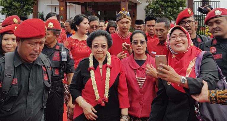 Tiba di lokasi, Megawati mendapat sambutan meriah dari ribuan kader partai. Dengan rapi mereka berdiri dan meminta salaman dengan Sang Ketua Umum.