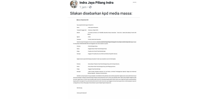 Foto surat pengunduran diri IJP sudah beredar luas, bertanggal hari ini (Sabtu, 16/9). Indra juga mempublikasikannya lewat akun media sosial Facebook.