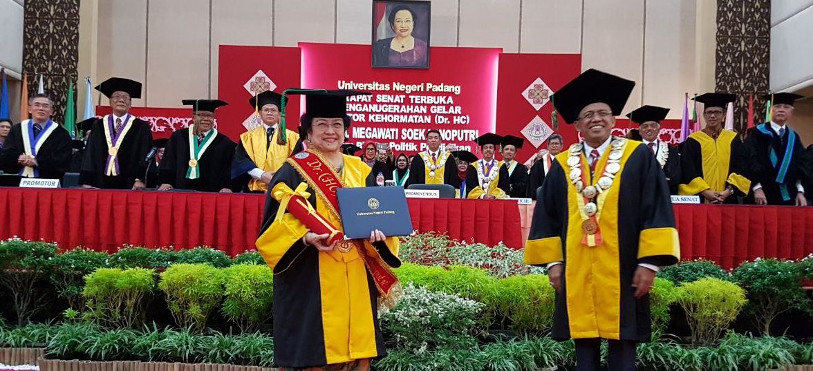 "Bagi saya, ilmu hanya akan menjadi ilmu jika bermanfaat bagi kemanusiaan. Saya berkomitmen untuk berjuang bersama civitas akademika Indonesia, termasuk yang berada di Universitas Negeri Padang untuk terus mendorong politik pendidikan yang dapat melahirkan akademisi-akademisi organik," demikian Megawati.