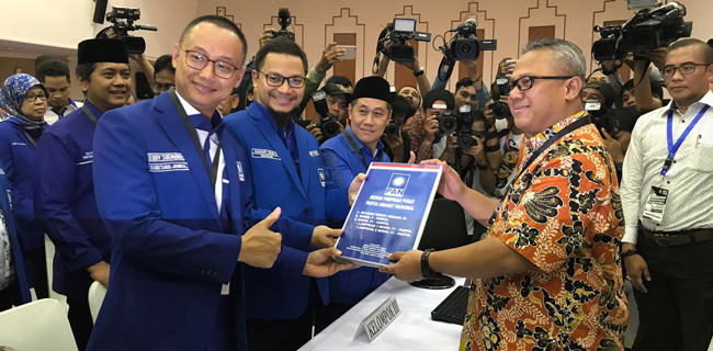 PAN mendaftarkan diri sebagai peserta Pemilu 2019, Jumat (13/10). Ketua KPPN PAN Hanafi Rais, Sekjen PAN Eddy Soeparno, Sekretaris KPPN Viva Yoga Mauladi dan sejumlah jajaran pengurus juga menyerahkan seluruh dokumen persyaratan. Hingga saat ini, PAN adalah partai politik ketiga yang seluruh berkasnya telah dinyatakan lengkap oleh KPU.