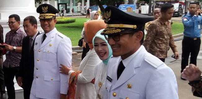 Anies dan Sandi yang sudah siap mengenakan pakaian dinas kegubernuran tiba lebih dulu untuk gladi bersih. Sedangkan pelantikan baru berjalan tepat pukul 16.00 WIB.
