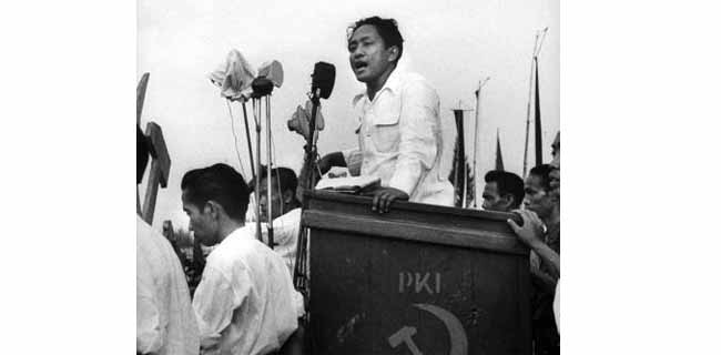 Dalam sebuah gambar pidato tokoh PKI, DN Aidit, tahun 1955 yang viral di medsos, sesosok orang yang berada di depan mimbar disebut warganet sebagai Jokowi.